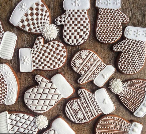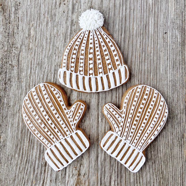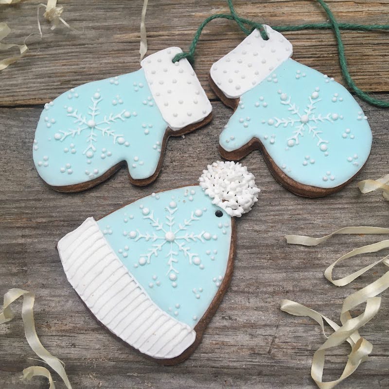 Zestaw trzech pierników – czapka i 2 rękawiczki – ozdobione ręcznie lukrem królewskim.
